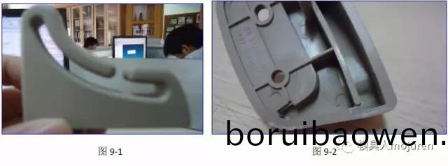 在這(zhe)裏(li)製品仍做(zuo)了1.2MM的反變形,澆(jiao)口由(you)原來(lai)的(de)牛角(jiao)進(jin)膠改爲(wèi)現(xiàn)在(zai)的(de)大(da)水(shui)口搭底(di)進膠(jiao),分流(liu)道改(gai)爲(wèi)(wei)了(le)S形(xing),可(ke)防止(zhi)主流(liu)道(dao)及(ji)分(fen)流道 的冷料(liao)進入糢(mo)腔。實(shi)際(ji)的試(shi)糢(mo)産品(pin)如圖(tu)9-1、9-2所(suo)示,産品(pin)無變形