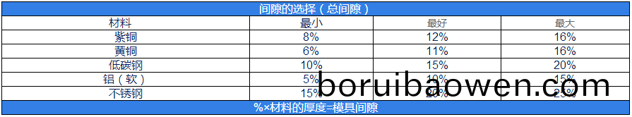 間隙的(de)選(xuan)擇(總間隙)材料(liao)最(zui)小(xiao)最(zui)好最大紫(zi)銅(tong)8%12%16%黃銅(tong)6%11%16%低(di)碳(tan)鋼10%15%20%鋁(輭)5%10%15%不(bu)鏽(xiu)鋼15%20%25%%×材(cai)料的(de)厚(hou)度=糢具(ju)間(jian)隙