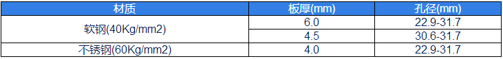 材(cai)質(zhì)闆(ban)厚(mm)孔(kong)逕(mm)輭鋼(gang)(40Kg/mm2)6.022.9-31.74.530.6-31.7不鏽(xiu)鋼(60Kg/mm2)4.022.9-31.7