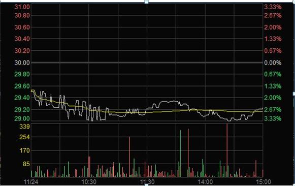 2011年11月23日臨近收盤期間(14:56:24至14:59:28),任某某為了在短期內(nèi)拉升股價(jià),大量申報(bào)買入“X”4筆共計(jì)63,000股,占尾市階段市場(chǎng)申買量的比例高達(dá)75.54%;委托價(jià)格由29.60元升至32.00元,每筆均高于當(dāng)時(shí)市場(chǎng)上的買1檔價(jià)格,三分鐘內(nèi)將股價(jià)由29.35元拉升至30元收盤,拉升幅度達(dá)2.21%。(見(jiàn)下圖)